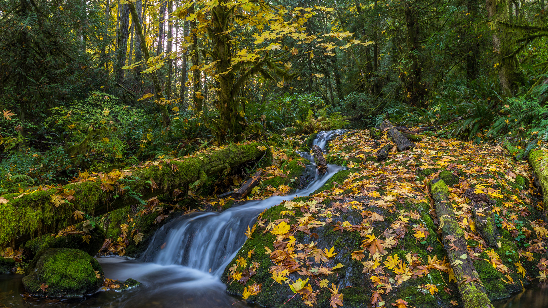 Edytor tapety: Omszały pień nad leśną rzeczką