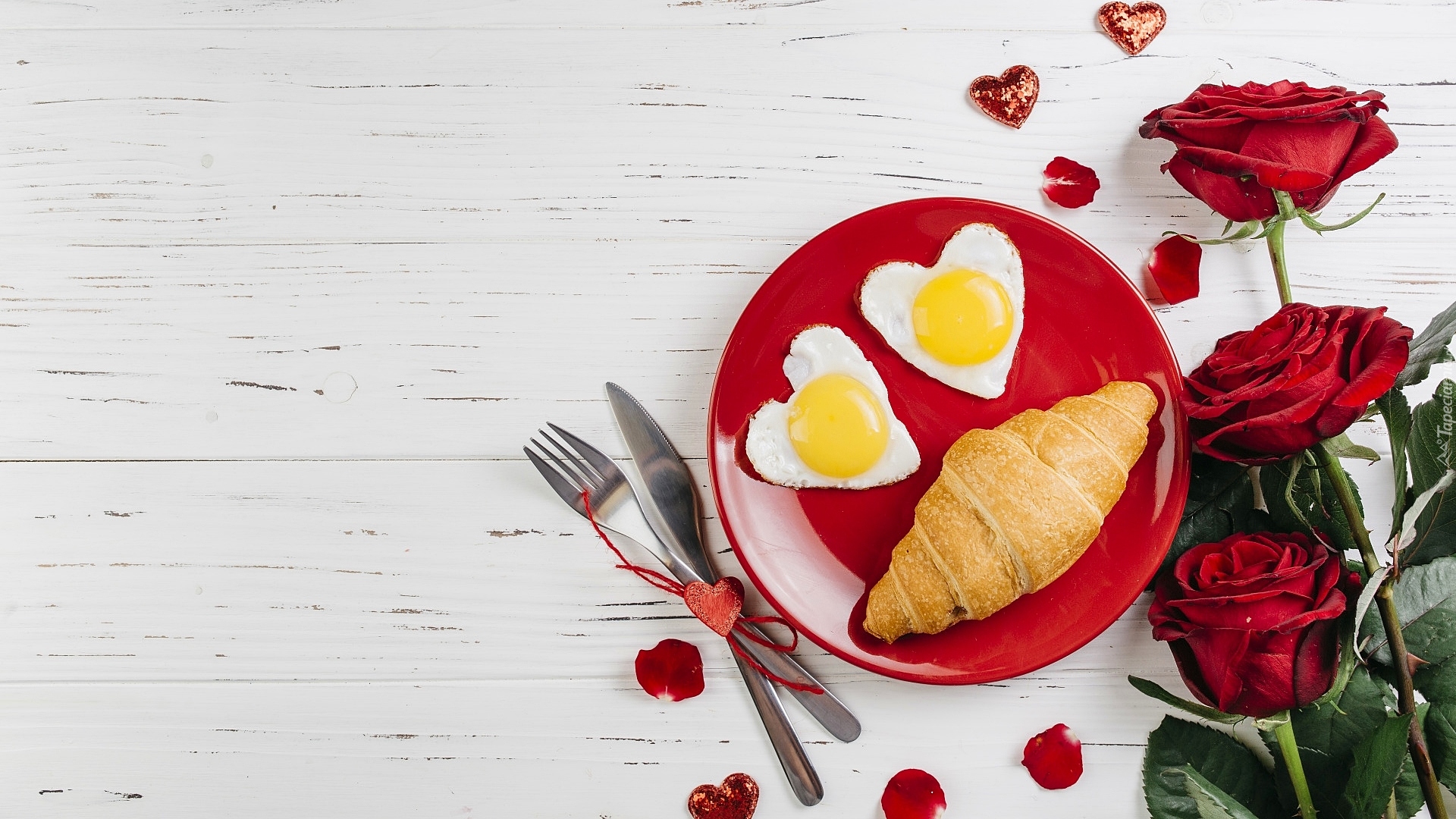 Edytor tapety: Dwa sadzone jajka w kształcie serca obok róż