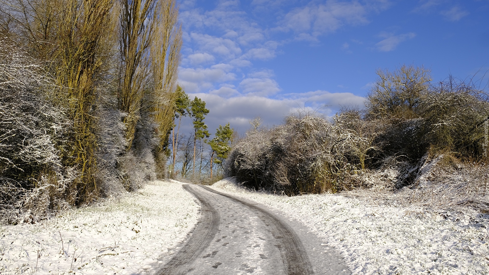 Edytor tapety: Droga pośród ośnieżonych drzew i krzewów
