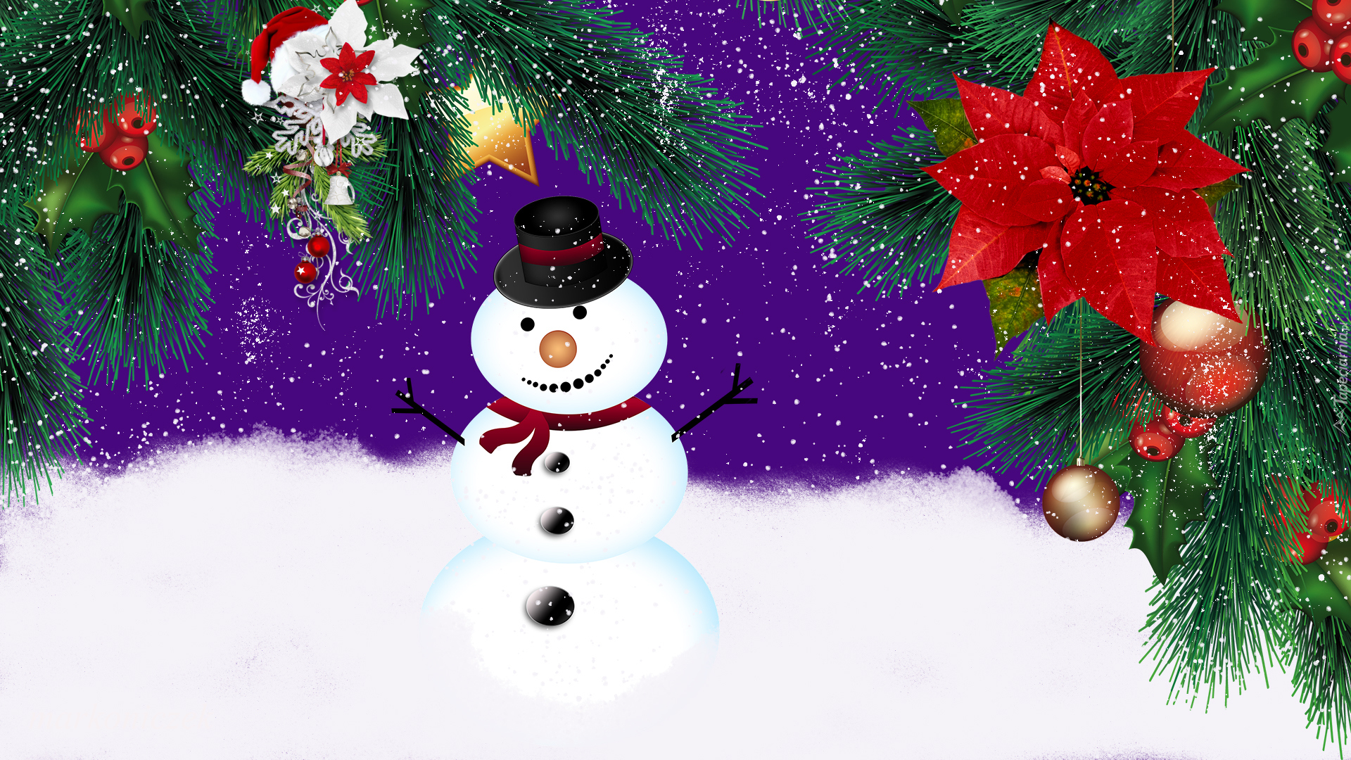 Edytor tapety: Bałwan pośród udekorowanych gałązek świerkowych
