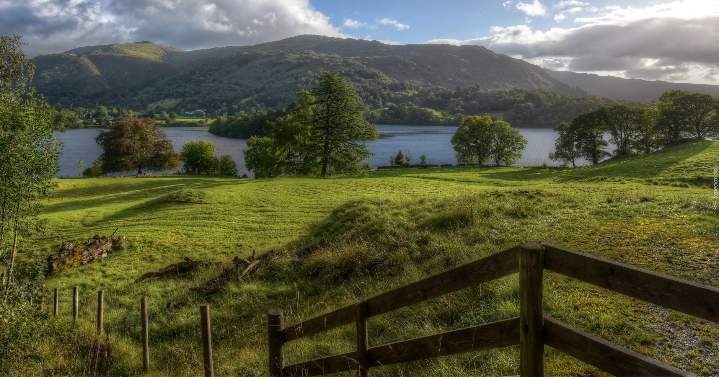Edytor tapety: Ogrodzona łąka na tle rzeki i wzgórz