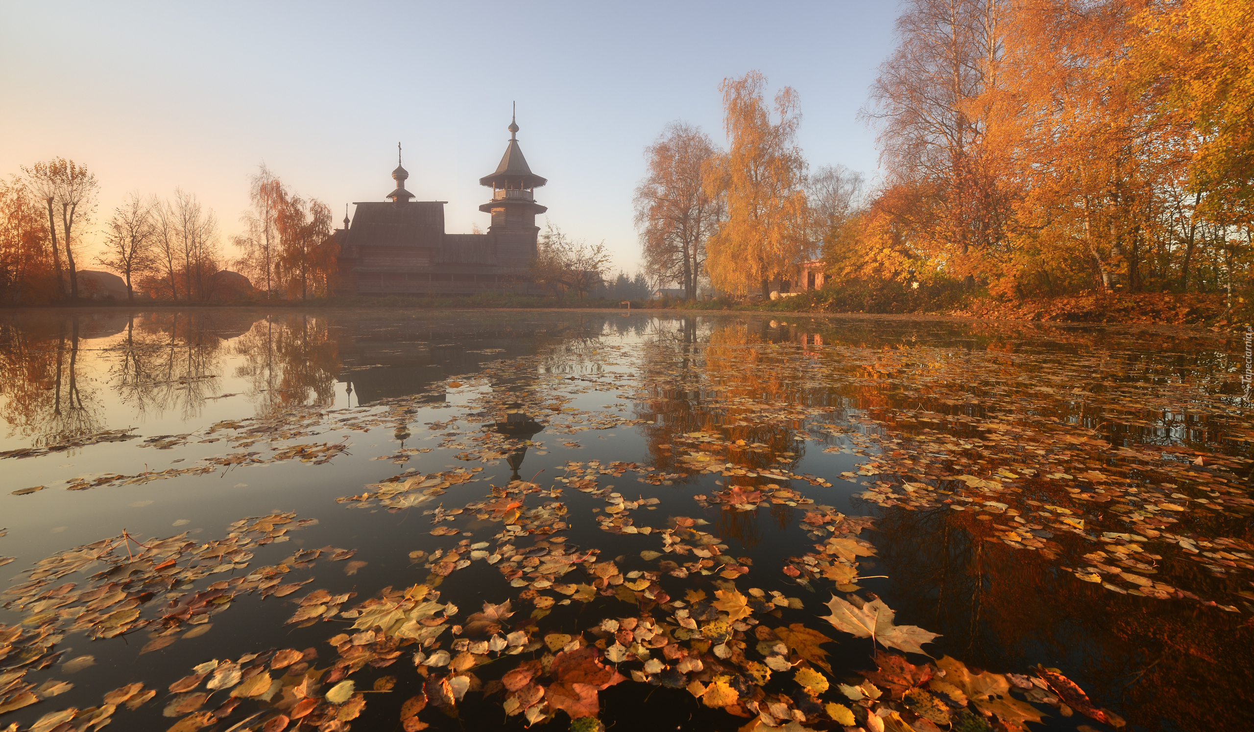 Edytor tapety: Kaplica nad jeziorem Onega pośród jesiennych drzew