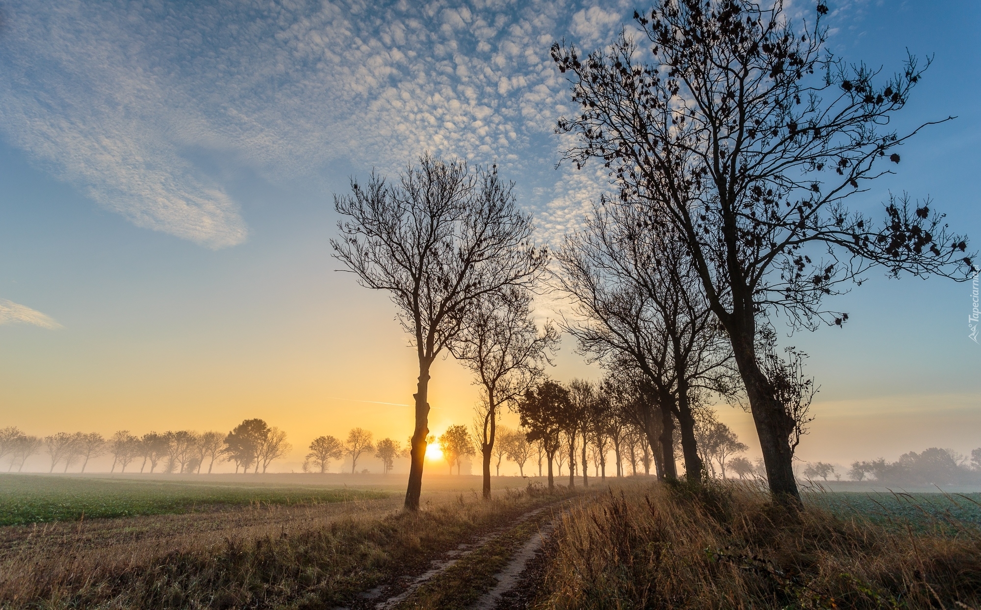 Edytor tapety: Zamglone pola o wschodzie słońca