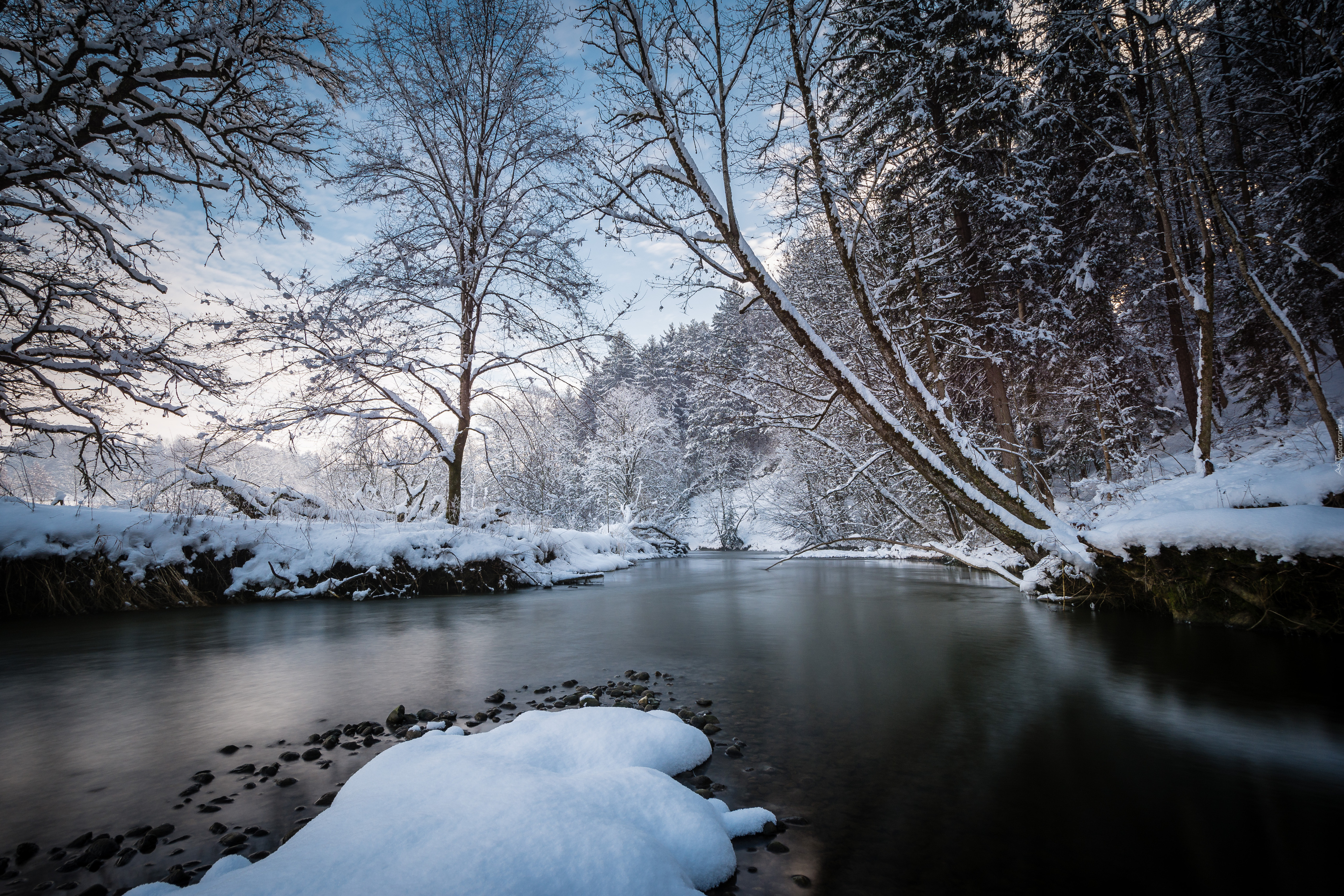 Edytor tapety: Ośnieżone drzewa pochylone nad rzeką