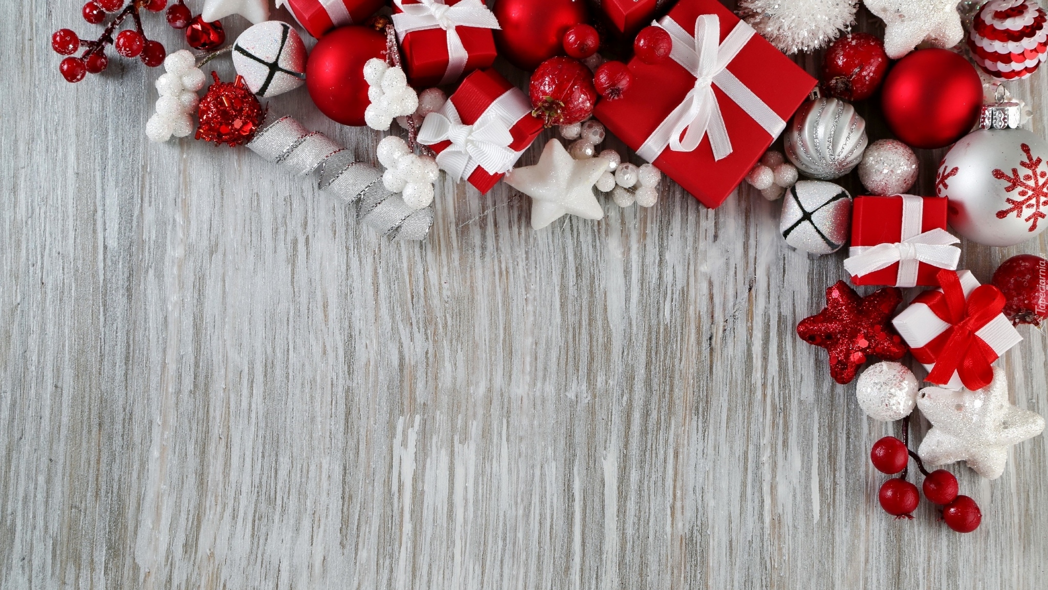 Edytor tapety: Białe i czerwone bombki pośród prezentów