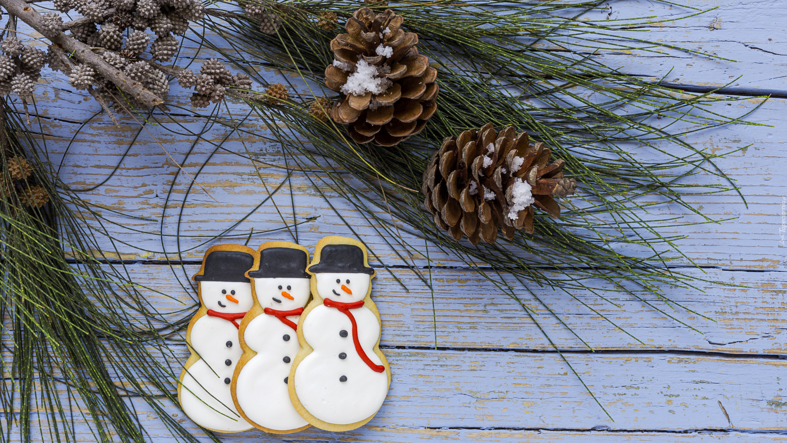 Edytor tapety: Piernikowe bałwanki obok gałązek z szyszkami