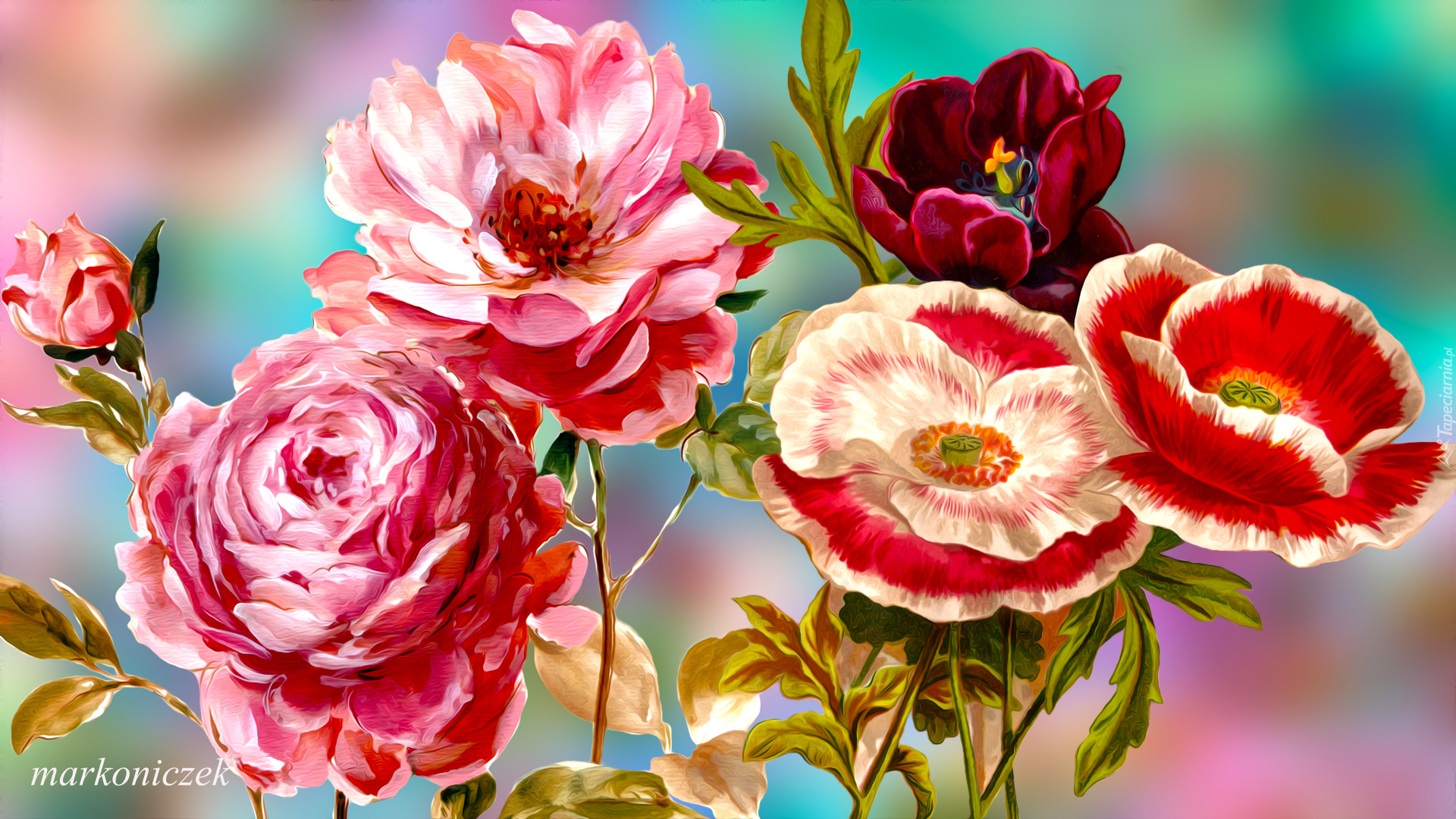 Edytor tapety: Róże i maki na rozmytym tle
