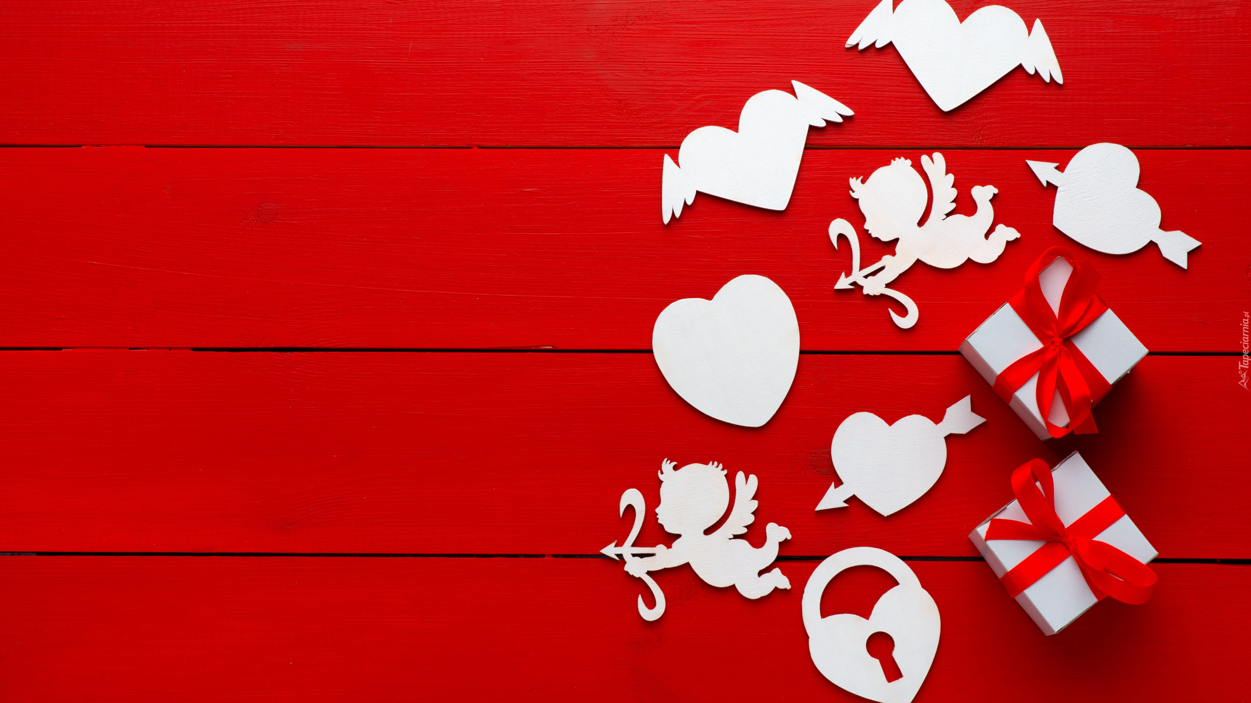 Edytor tapety: Serduszka i prezenty na czerwonych deskach