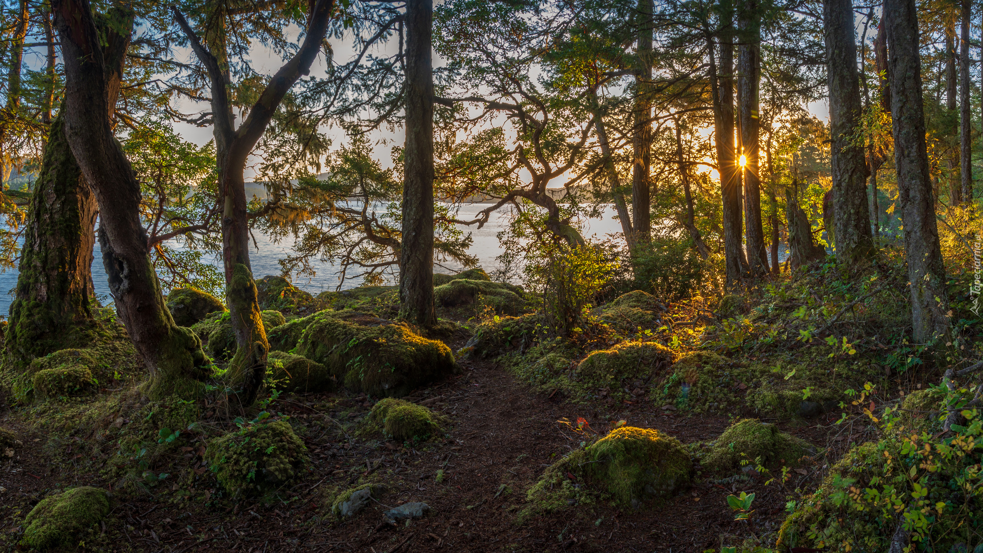 Edytor tapety: Omszałe kamienie i drzewa nad jeziorem