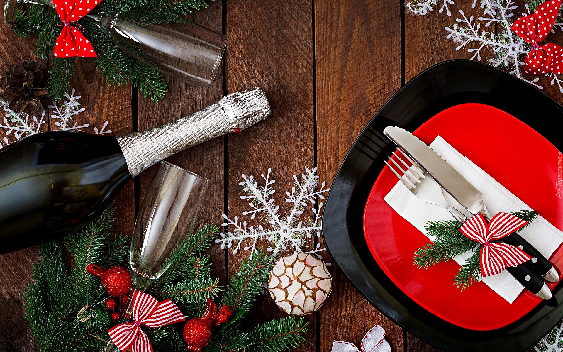Edytor tapety: Szampan i kieliszki obok gałązek przy talerzach