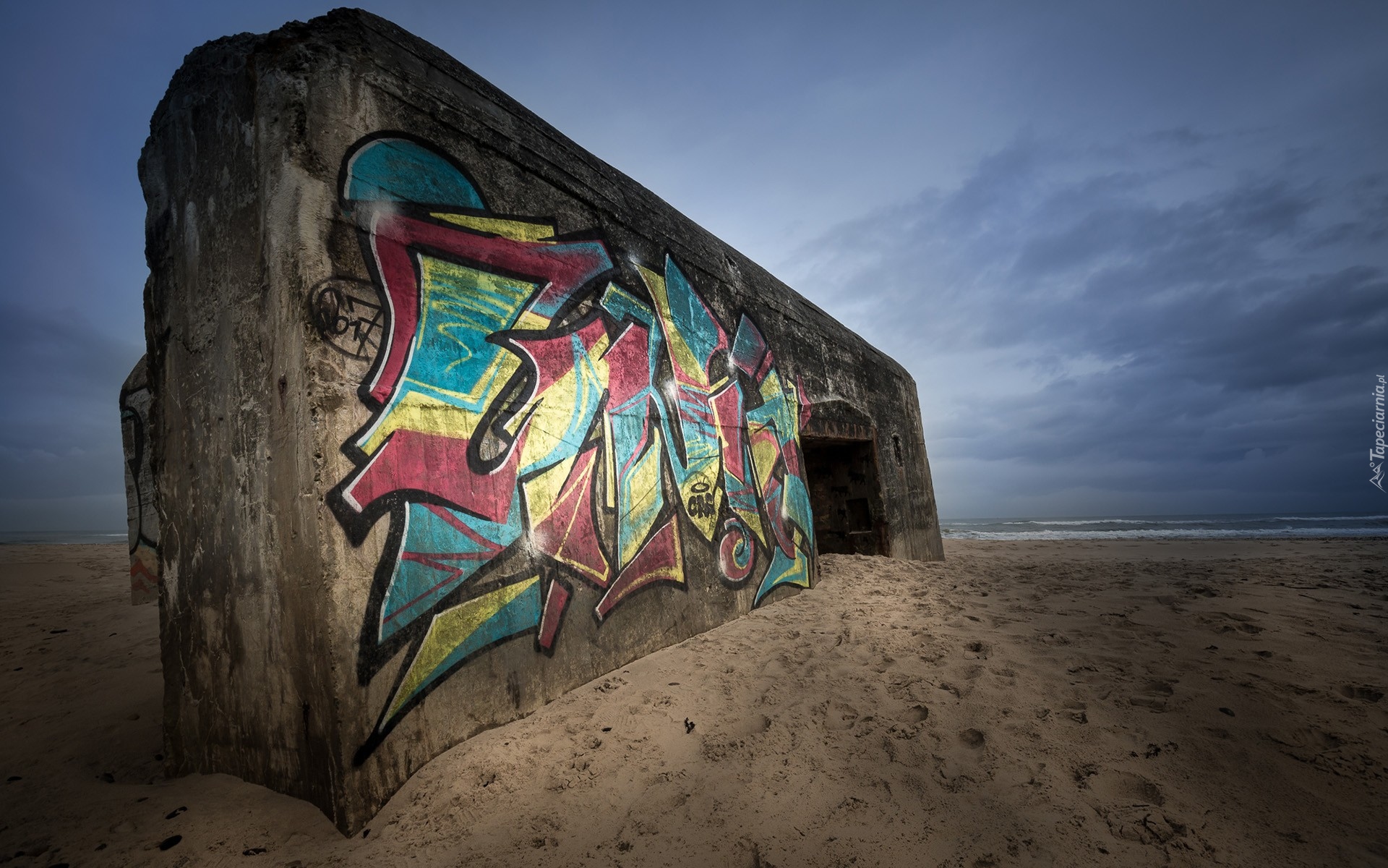 Edytor tapety: Betonowa ściana z graffiti na plaży