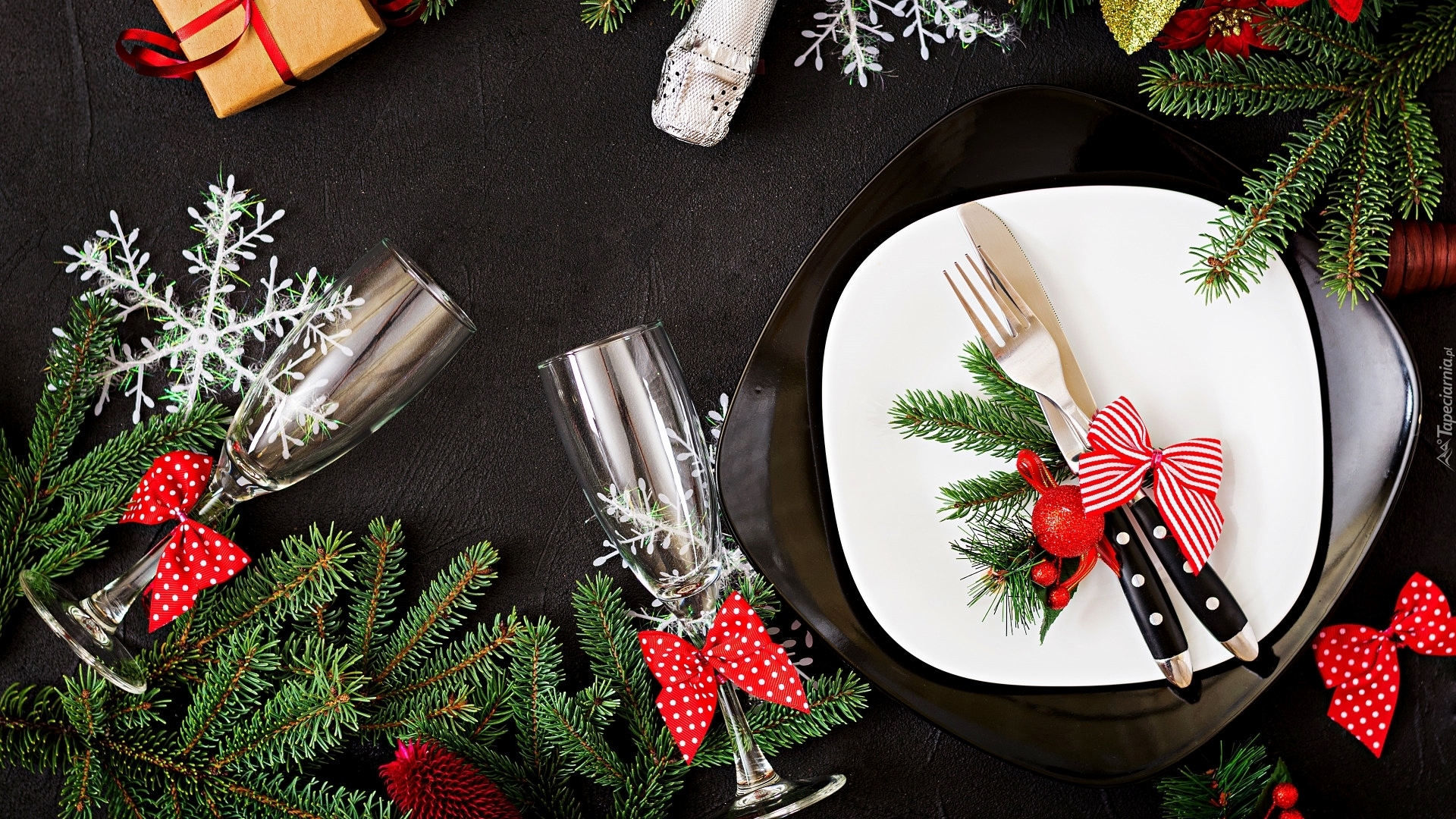 Edytor tapety: Świąteczna dekoracja obok kieliszków i talerzy