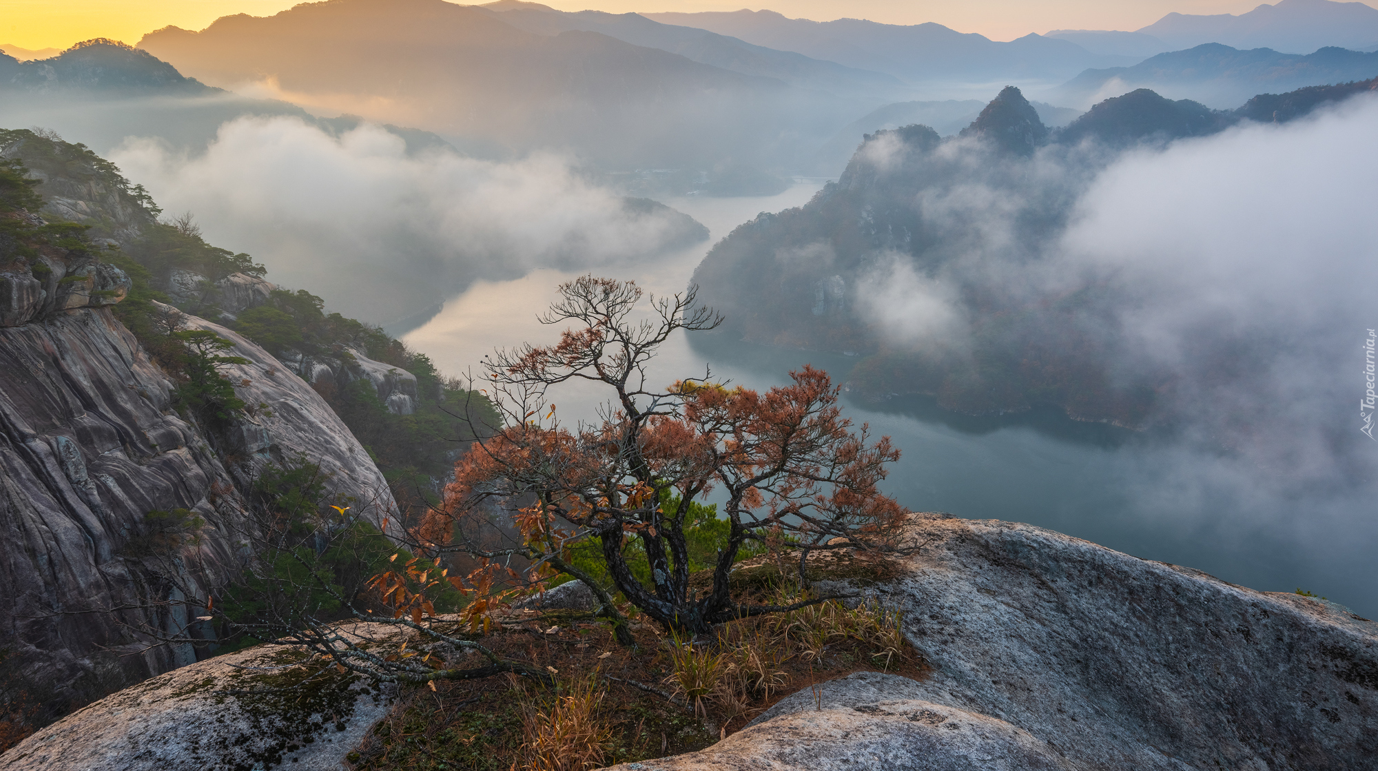 Edytor tapety: Drzewo na skale w górskim krajobrazie