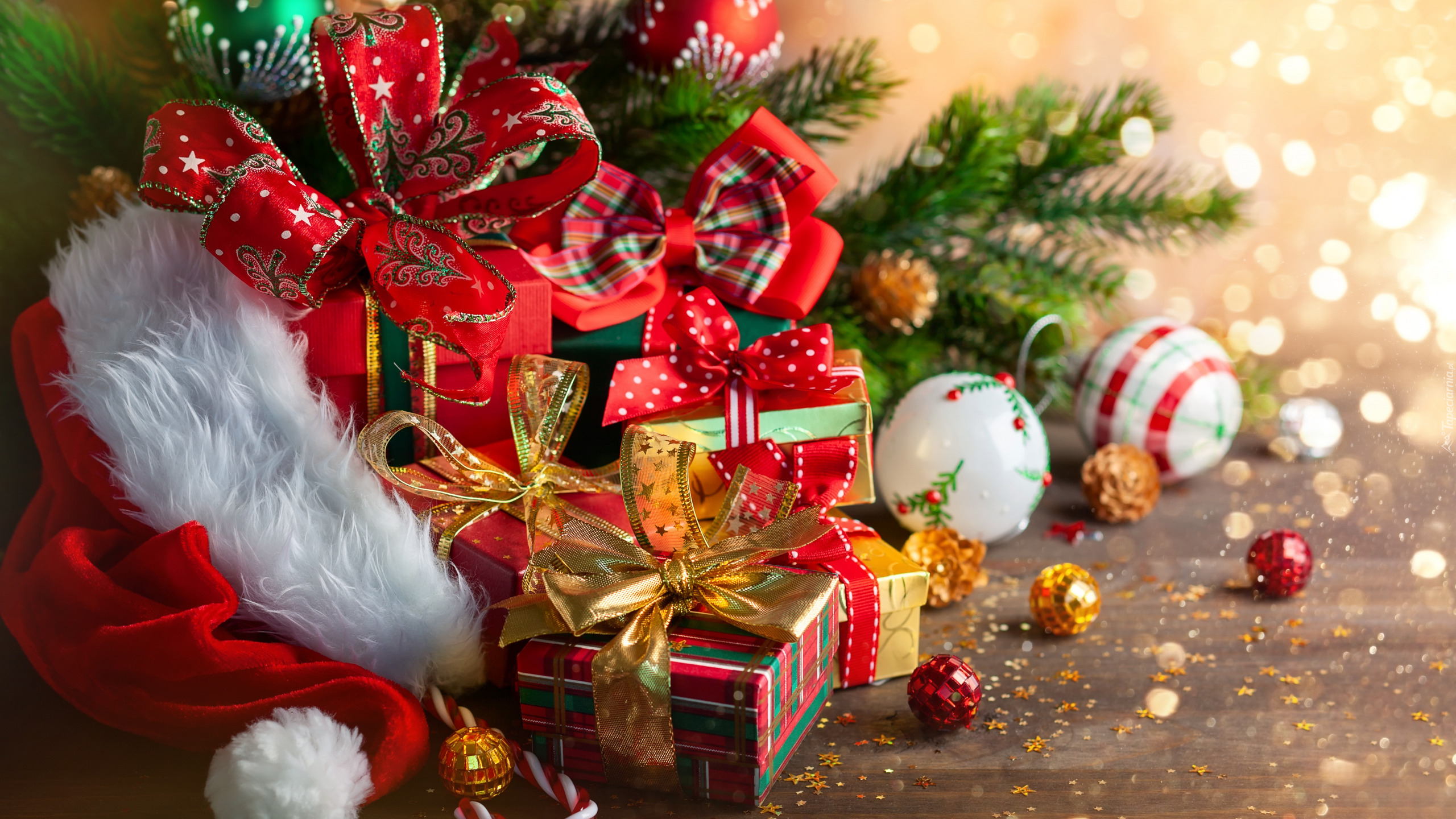 Edytor tapety: Czapka Mikołaja pośród prezentów świątecznych