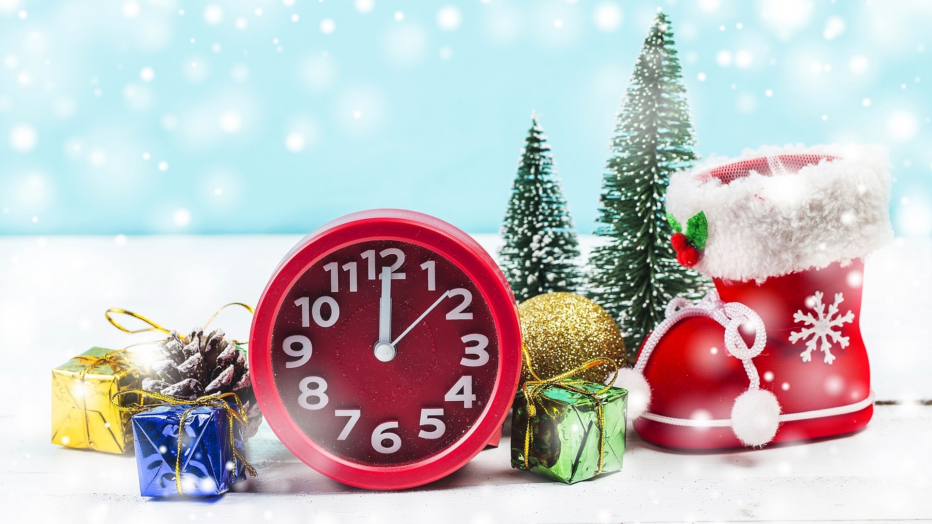 Edytor tapety: Zegar obok prezencików i świątecznego buta