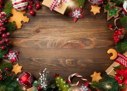 Edytor tapety: Prezenty obok ciasteczek i gałązek w kompozycji świątecznej