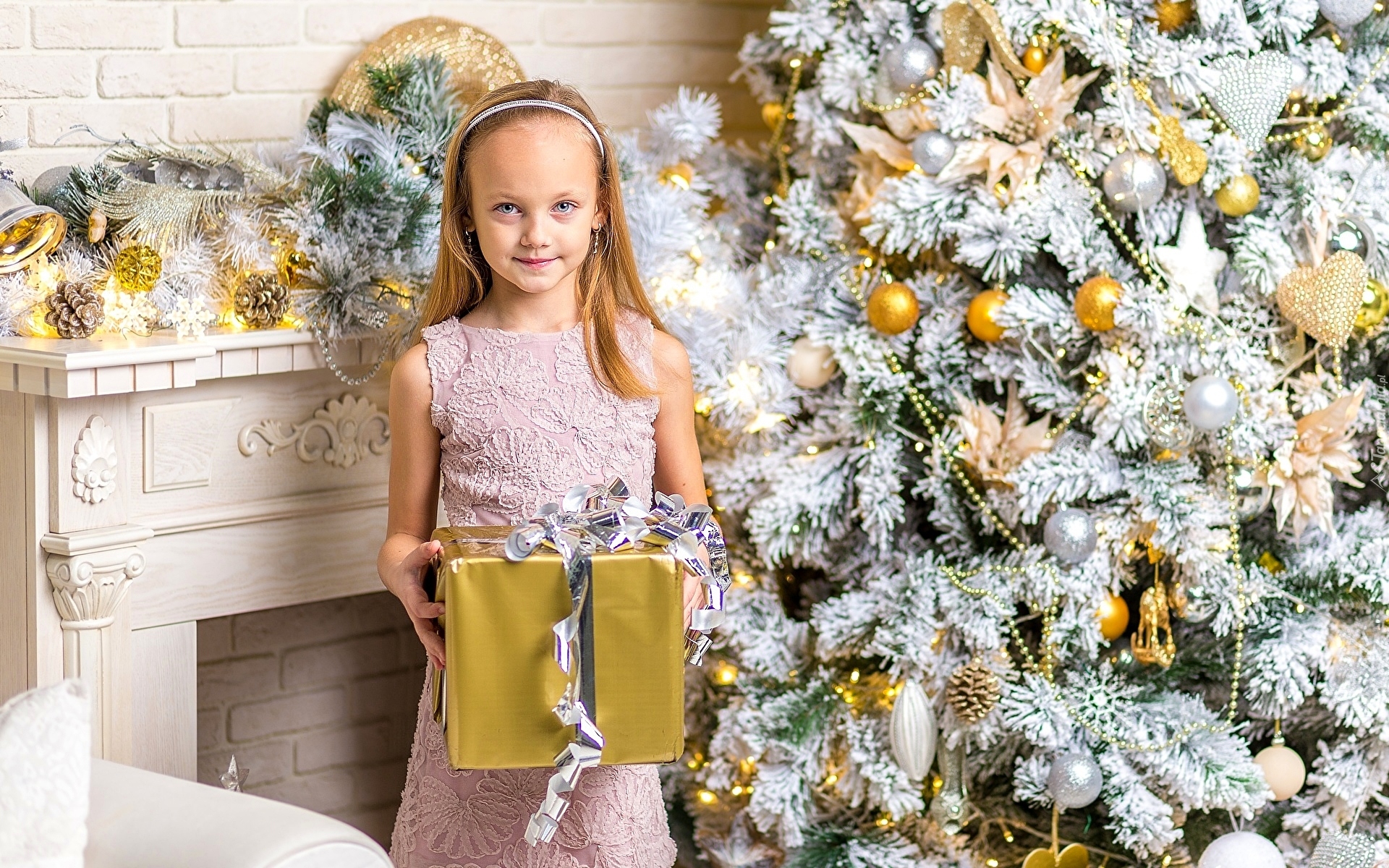 Edytor tapety: Dziewczynka z prezentem obok choinki
