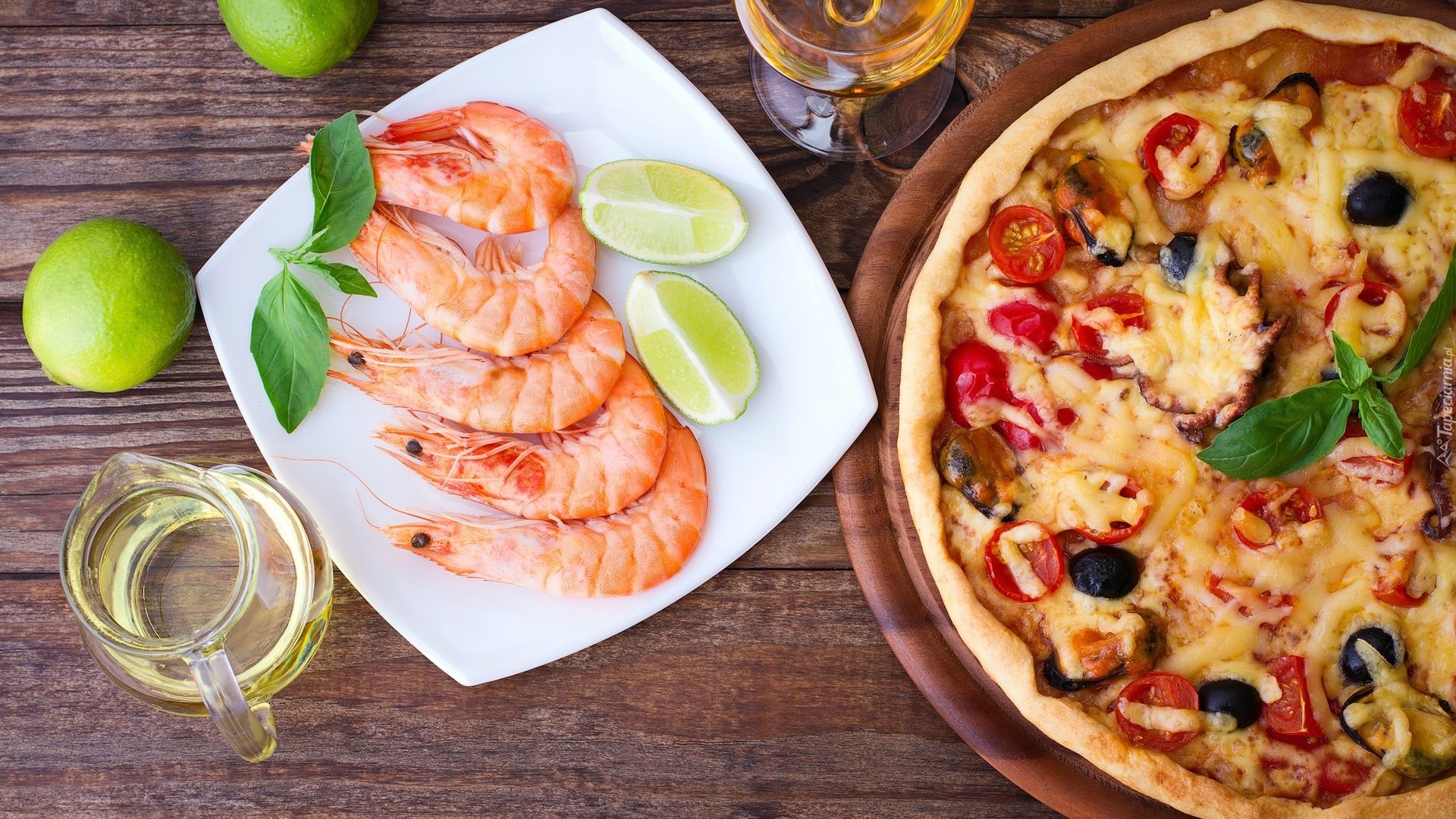 Edytor tapety: Krewetki na talerzu obok pizzy na desce