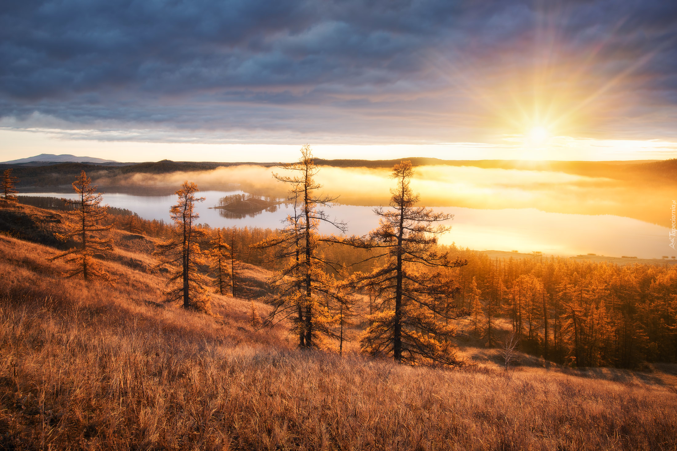 Edytor tapety: Jesienny krajobraz z jeziorem w promieniach słońca