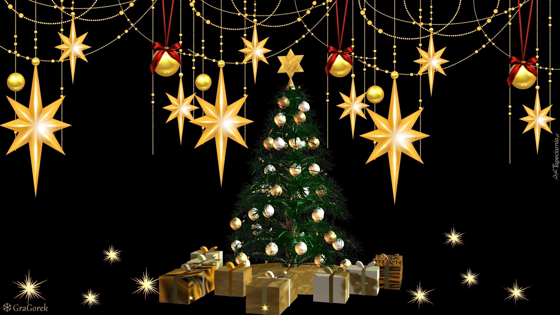 Edytor tapety: Graficzne gwiazdki i bombki zwisające nad choinką