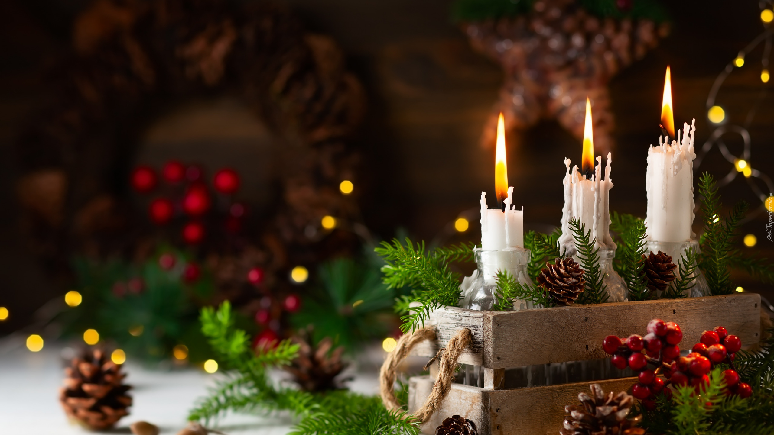 Edytor tapety: Trzy palące się świeczki w dekoracji świątecznej