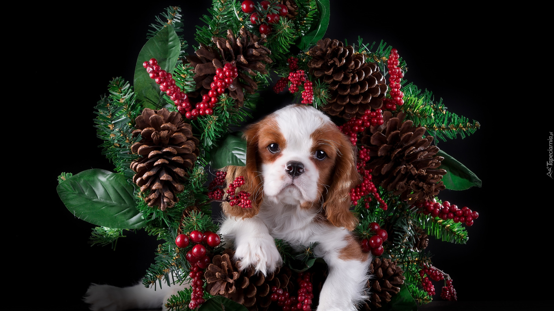 Edytor tapety: Cavalier king charles spaniel w świątecznym wieńcu