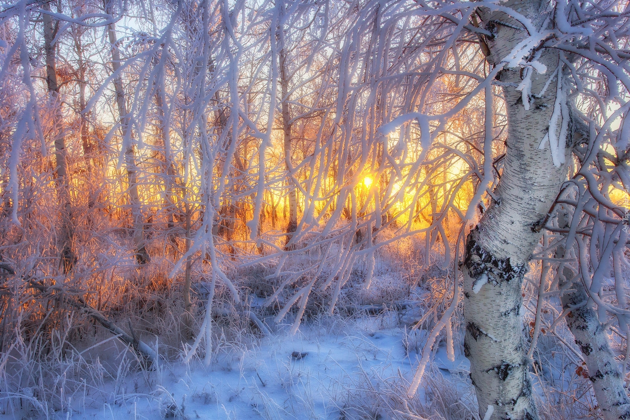 Edytor tapety: Ośnieżone gałęzie w blasku słońca