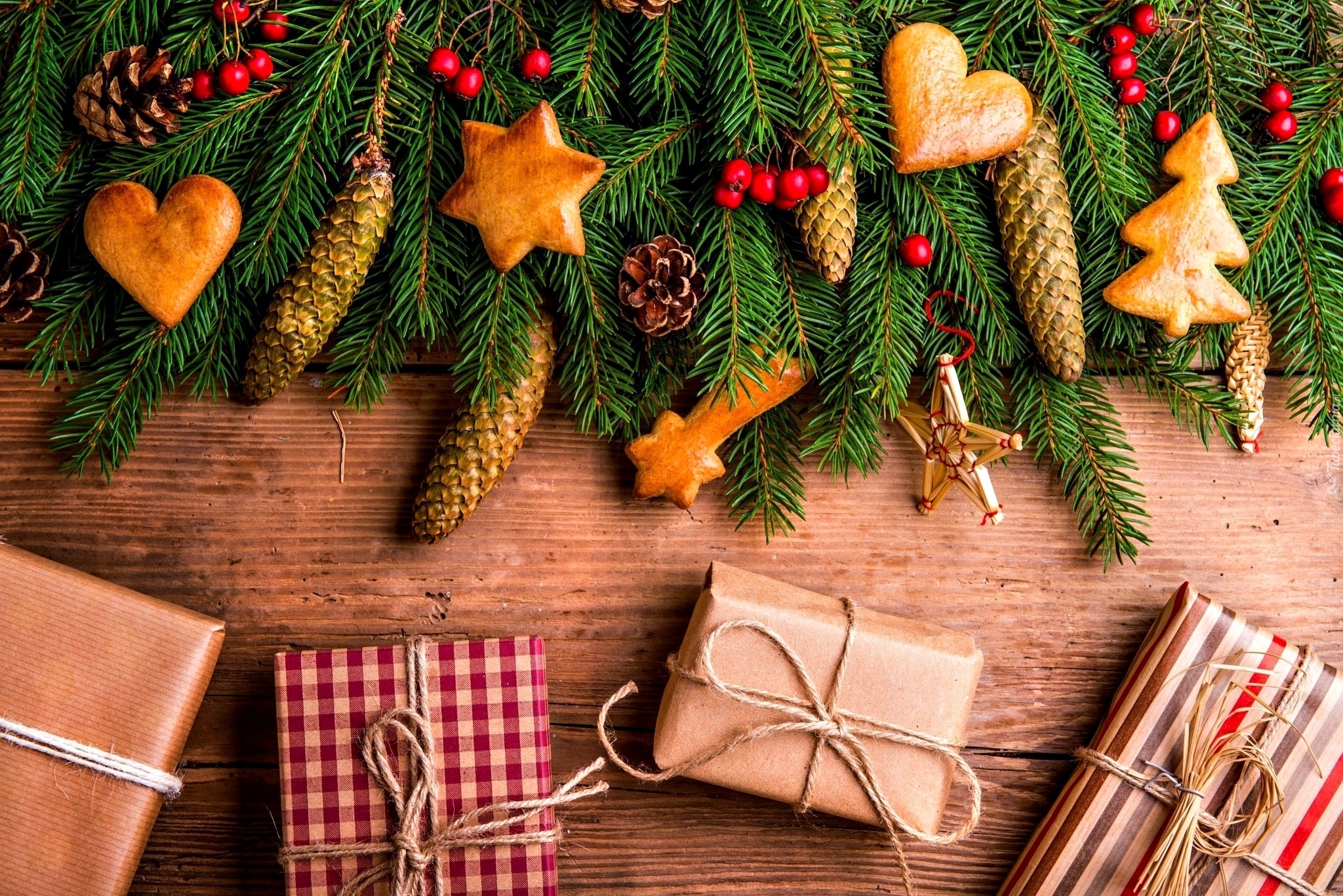 Edytor tapety: Świąteczna kompozycja z prezentami i piernikami