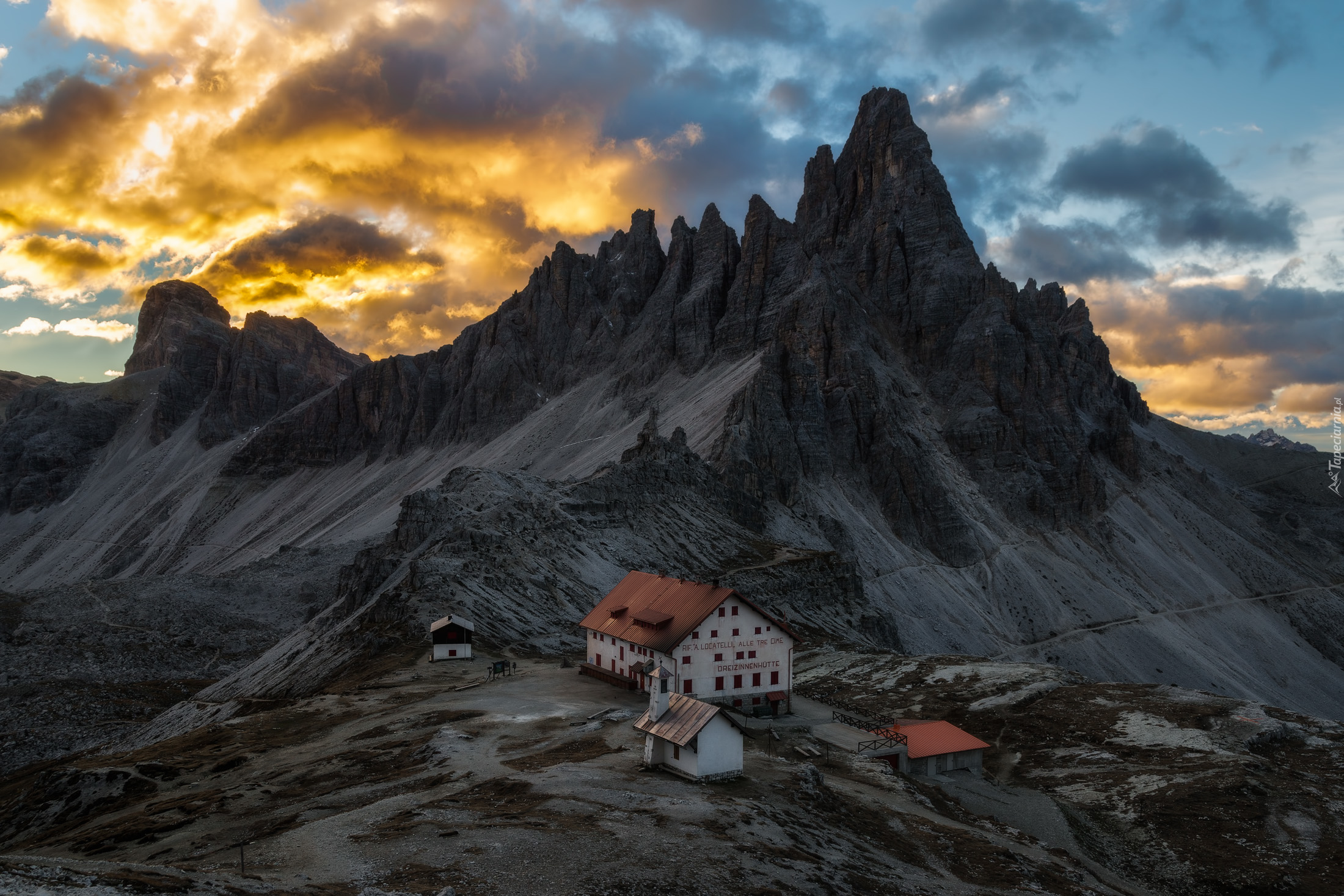 Edytor tapety: Masyw Tre Cime di Lavaredo z domkami