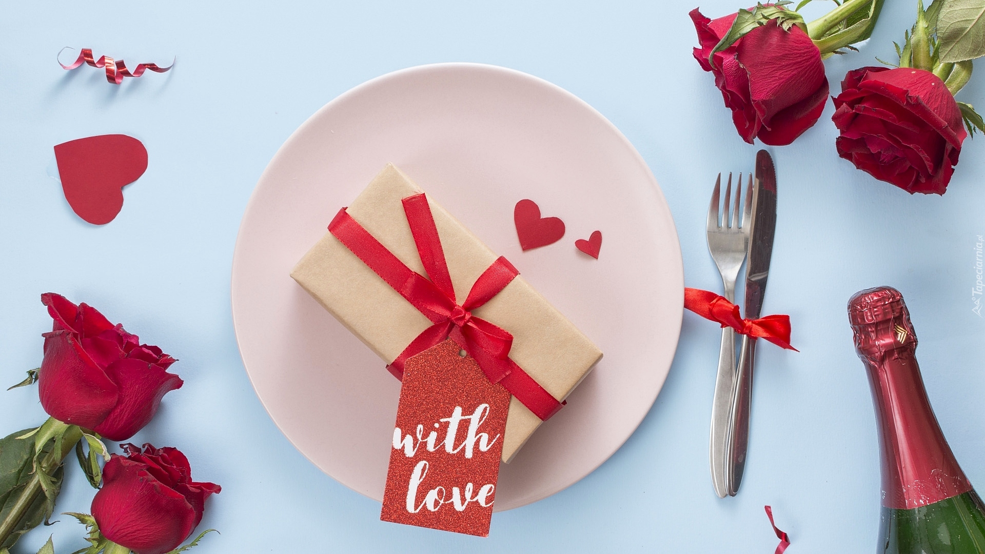 Edytor tapety: Róże z szampanem i prezentem na Walentynki