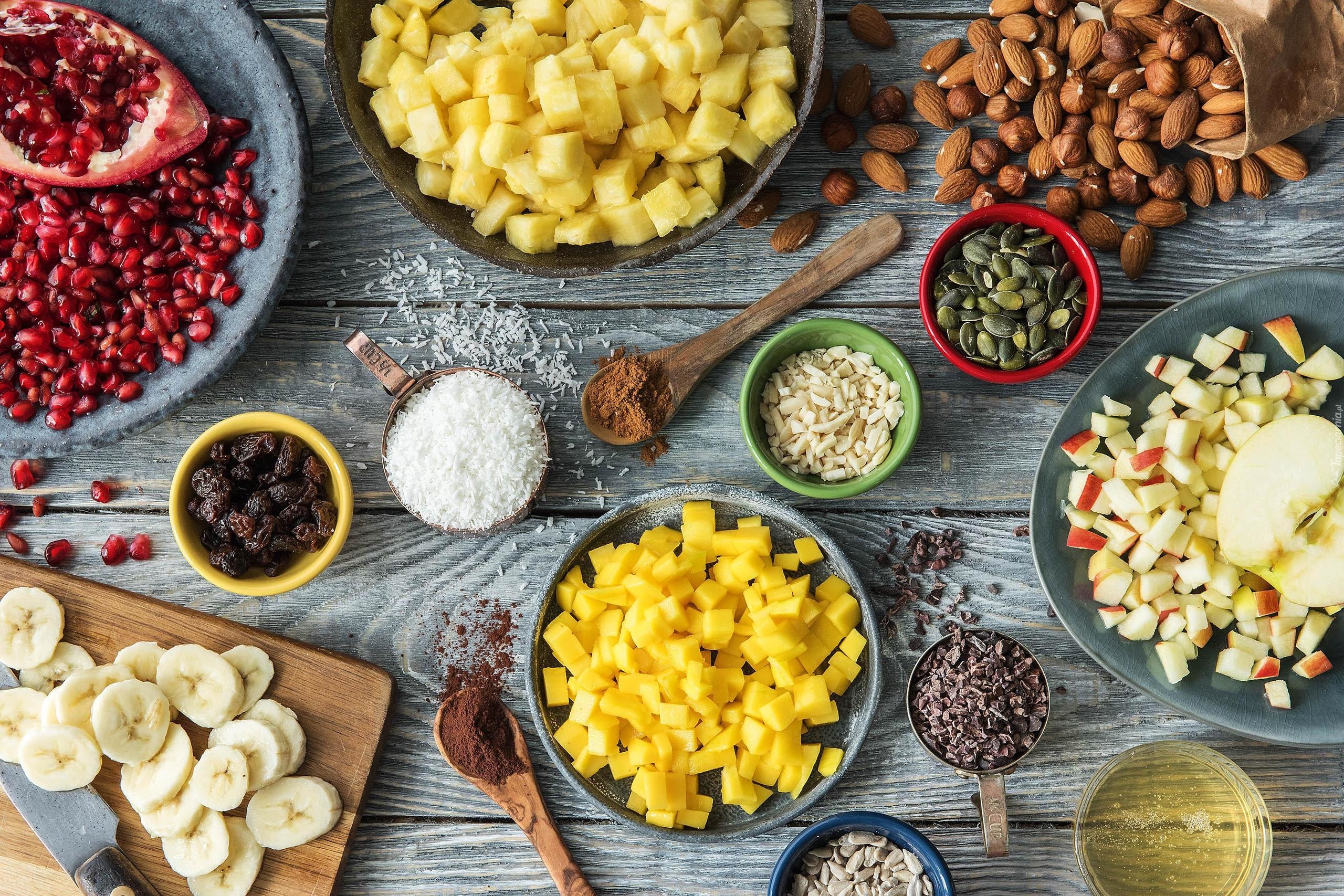 Edytor tapety: Pokrojone owoce w miseczkach obok bakalii