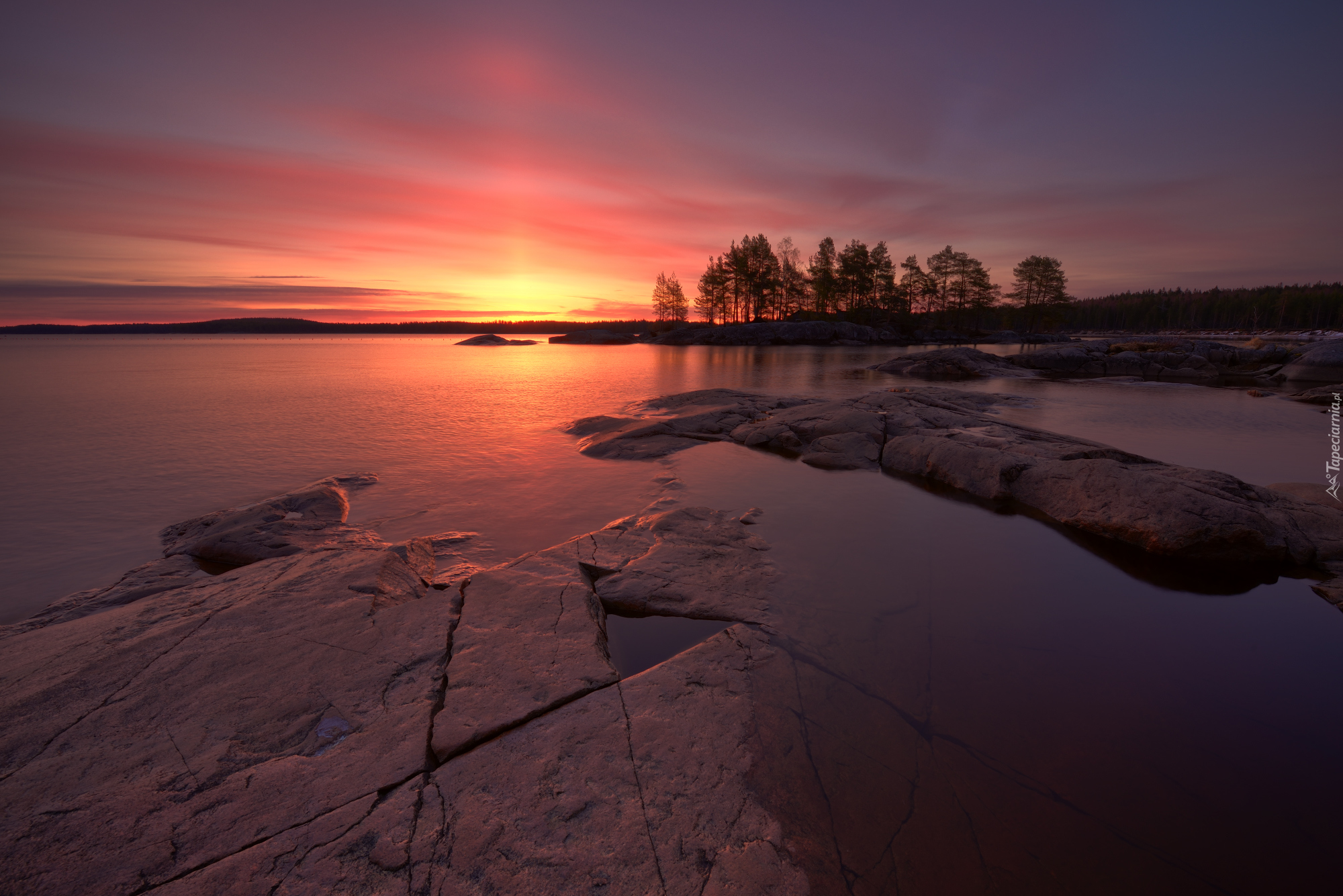 Edytor tapety: Drzewa w blasku zachodzącego słońca nad jeziorem Onega
