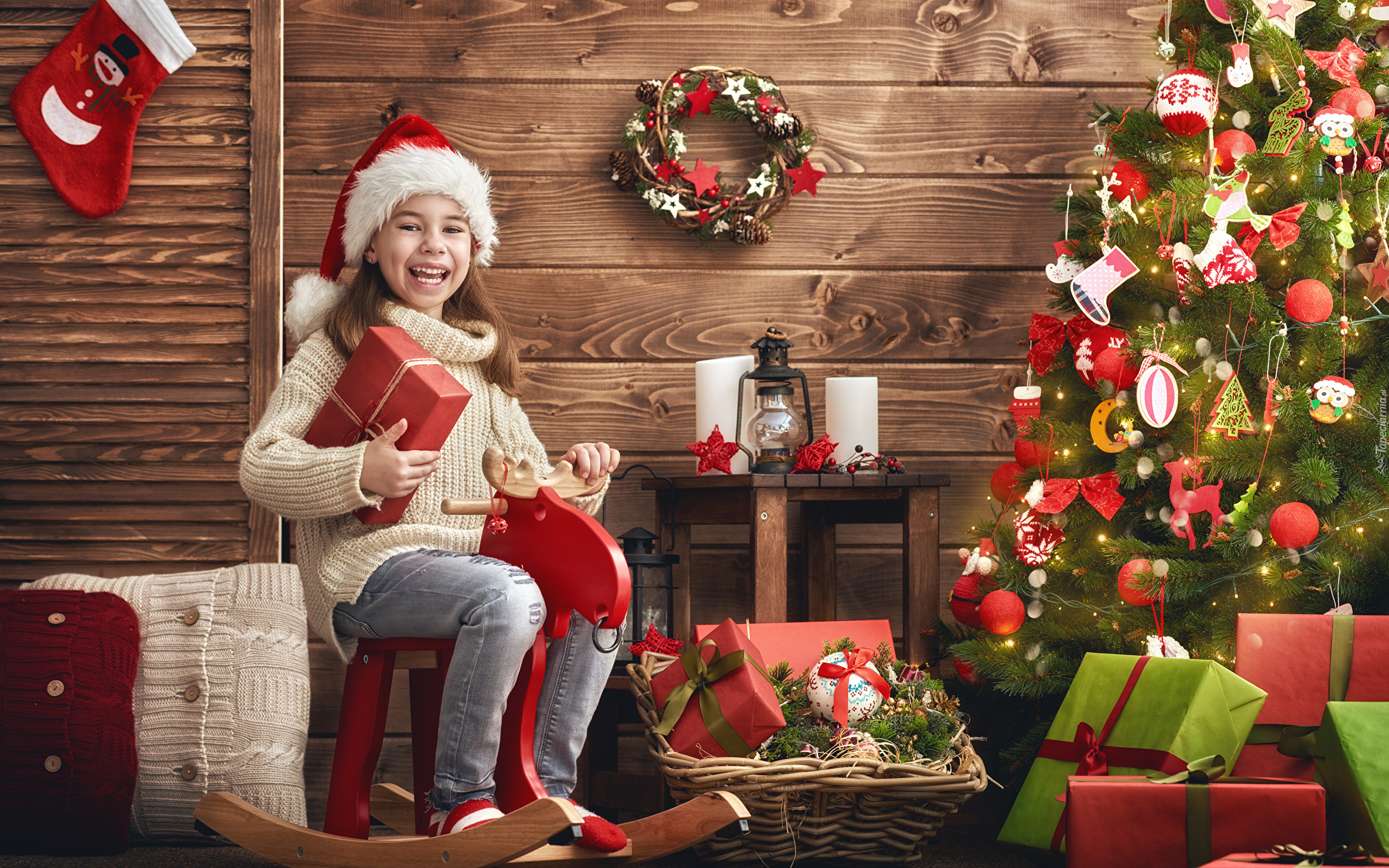 Edytor tapety: Radosna dziewczynka z prezentami przy choince