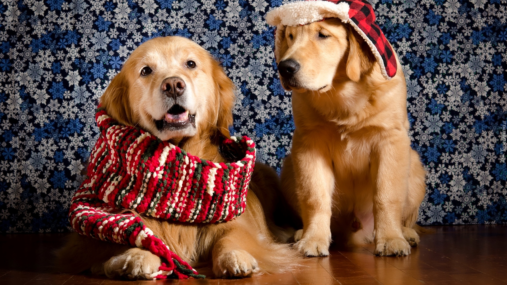 Edytor tapety: Goldeny retrievery w szaliku i czapce
