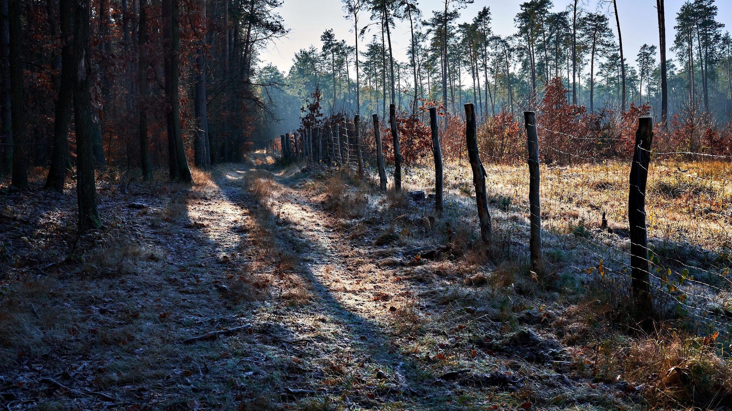 Edytor tapety: Ogrodzenie wzdłuż drogi w lesie
