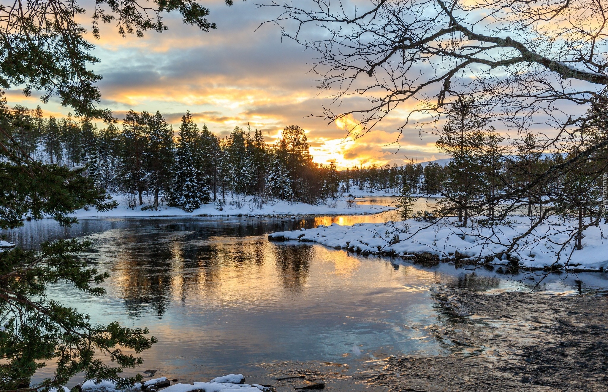 Edytor tapety: Wschód słońca nad zimową leśną rzeką
