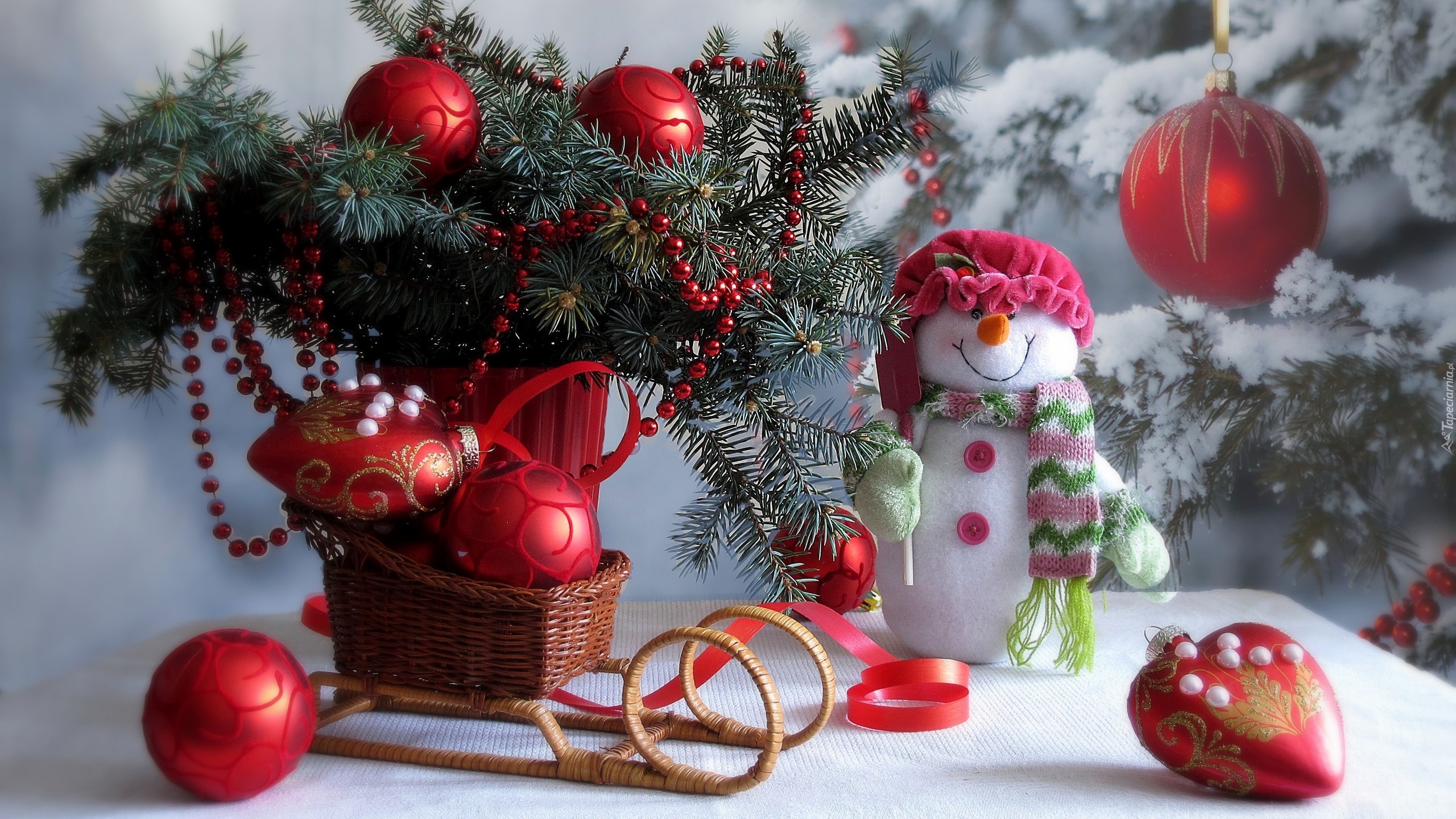 Edytor tapety: Bałwanek obok bombek na gałązkach