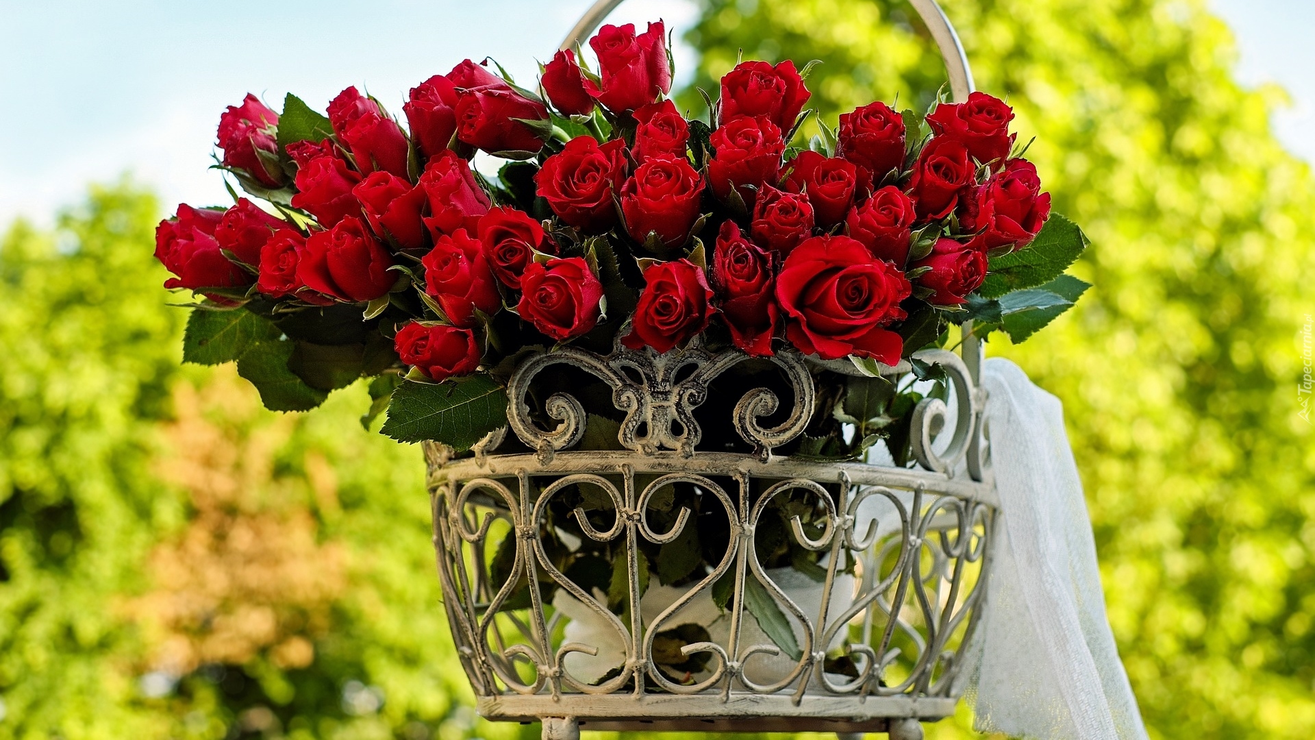 Edytor tapety: Bukiet czerwonych róż w kwietniku