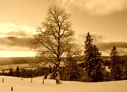 Edytor tapety: Ośnieżone drzewa na wzgórzach o poranku