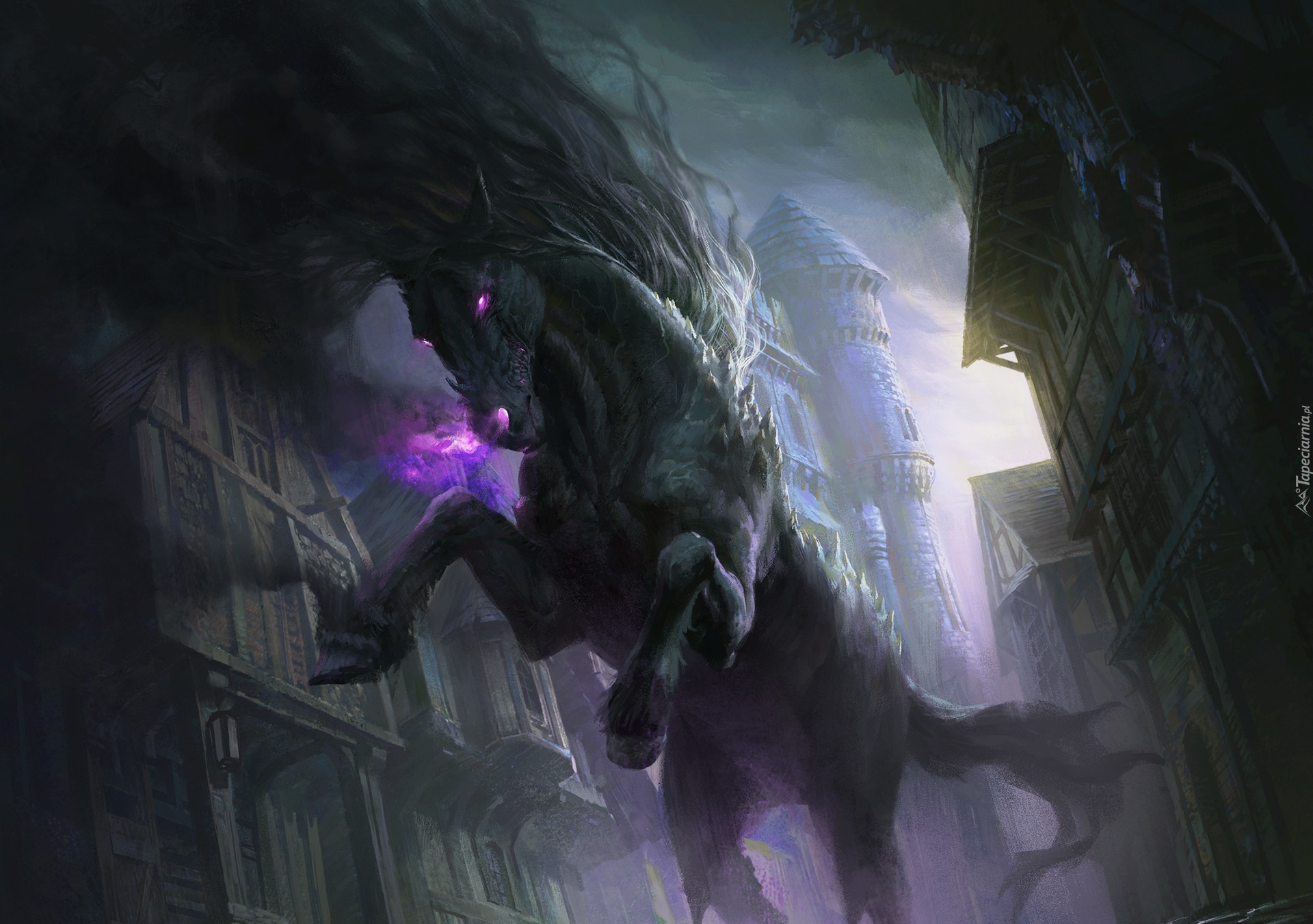 Edytor tapety: Koń na tle zabudowań w grafice fantasy