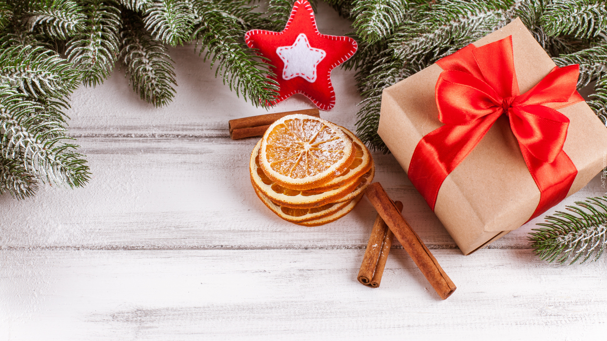 Edytor tapety: Prezent obok plasterków pomarańczy i czerwonej gwiazdki