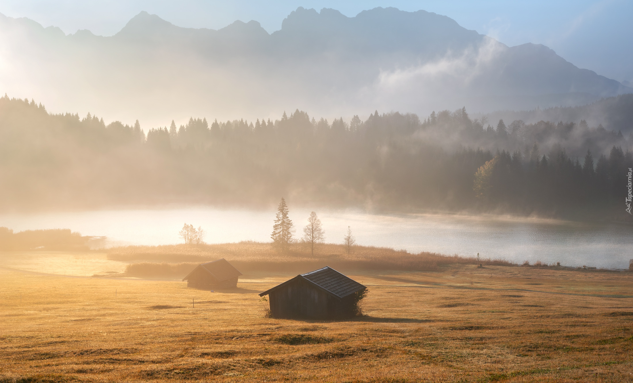 Edytor tapety: Drewniane domki na tle zamglonych gór