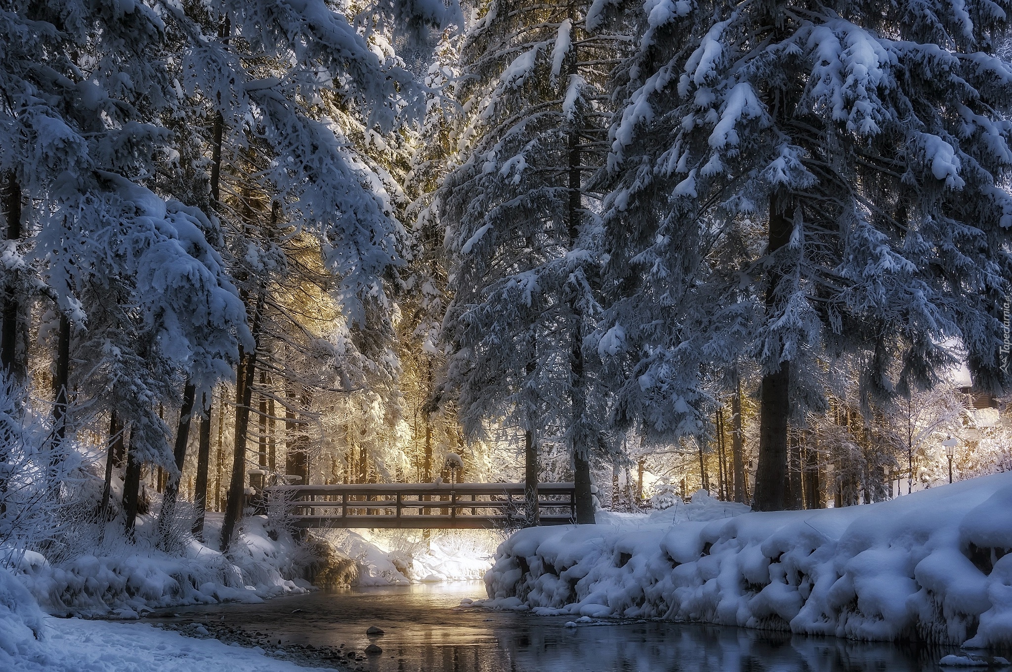 Edytor tapety: Drewniany mostek nad rzeką w parku