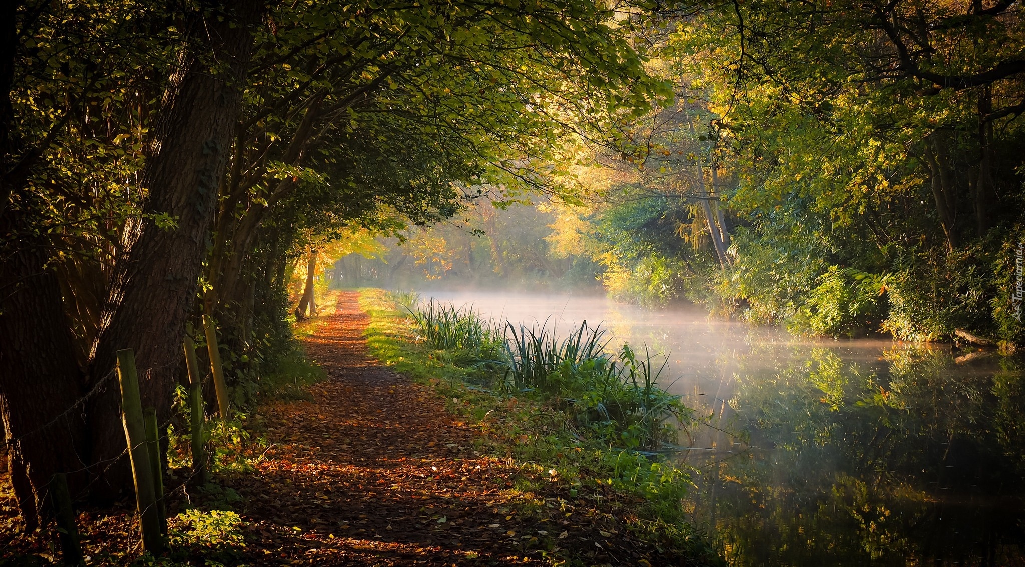 Edytor tapety: Ścieżka wzdłuż zamglonej rzeki w lesie