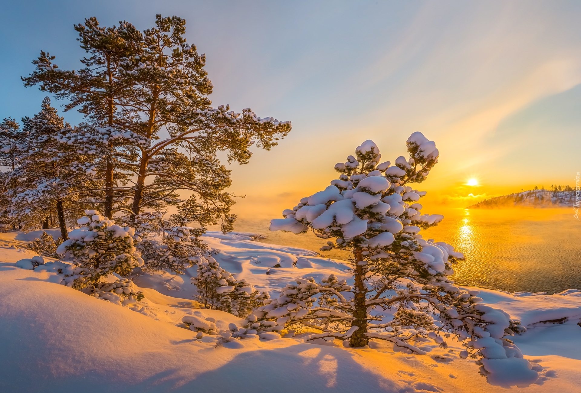 Edytor tapety: Ośnieżone drzewa nad jeziorem Ładoga