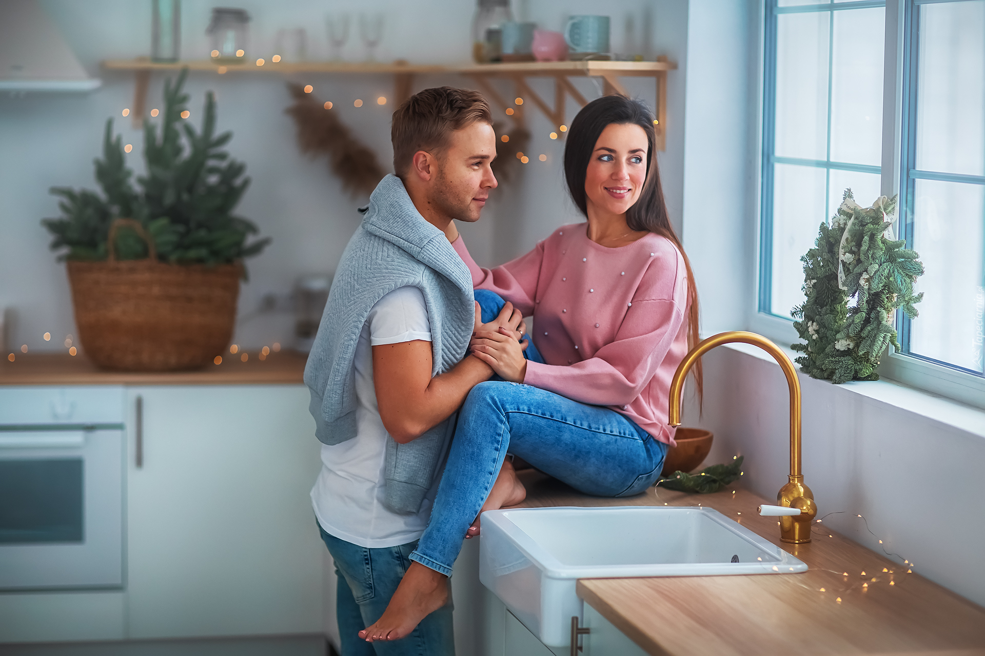 Edytor tapety: Kobieta i mężczyzna spoglądający w okno