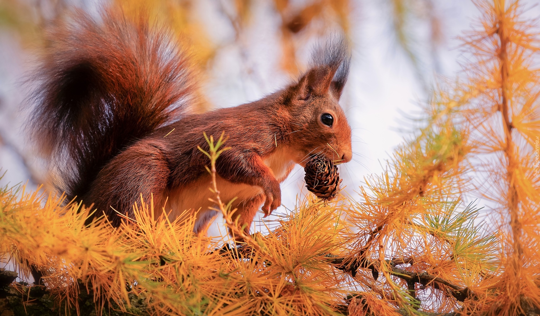 Edytor tapety: Wiewiórka z szyszką na modrzewiu