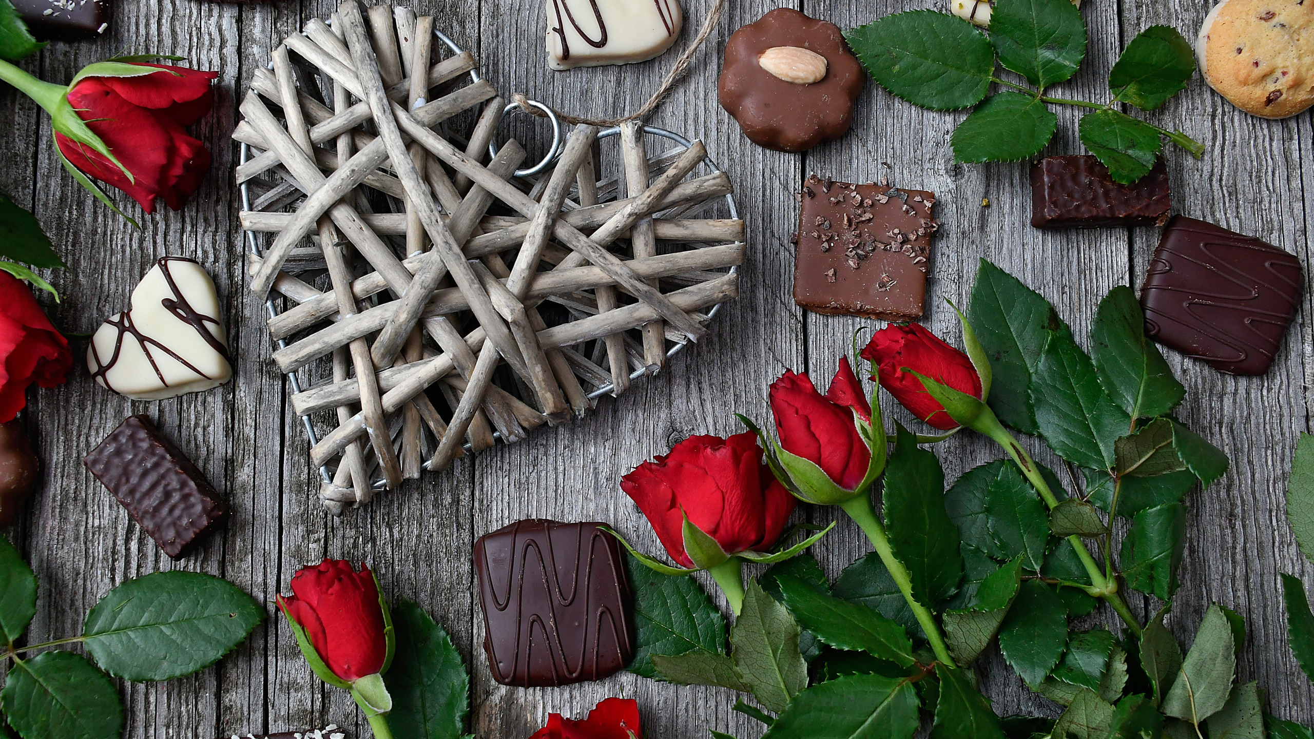Edytor tapety: Czekoladki i róże ułożone wokół serca