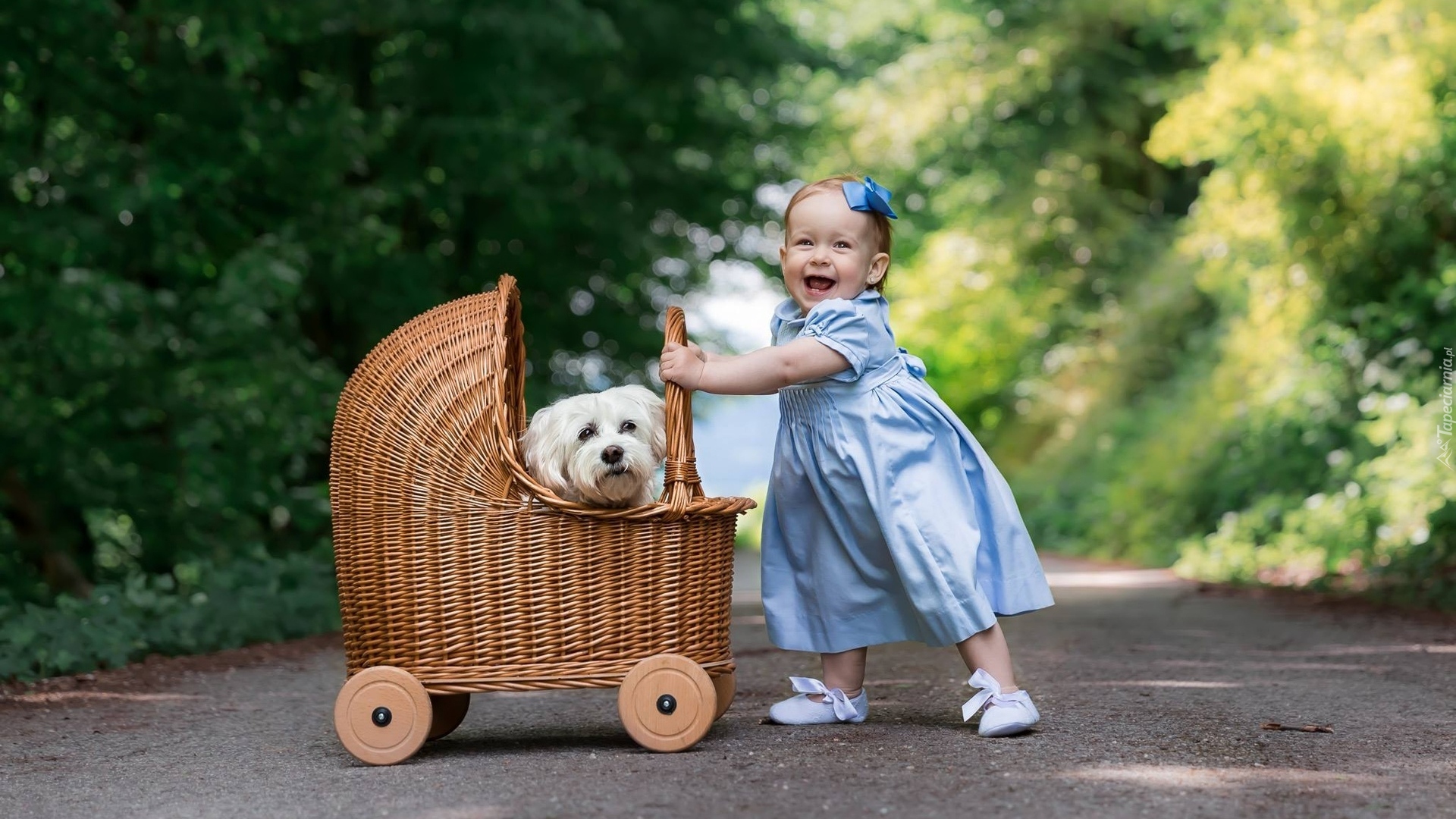 Edytor tapety: Dziewczynka z maltańczykiem w wózku