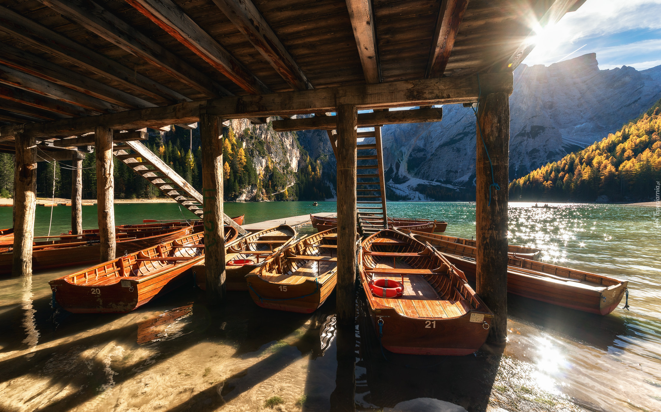 Edytor tapety: Łódki przy palach na jeziorze